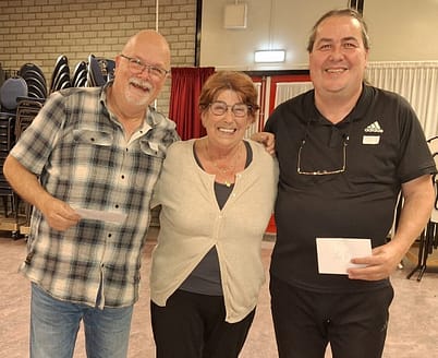 Op de foto de winnaars van het darttoernooi Mart en Bart geflankeerd door de horeca-beheerder van ’t Wonder Jeanne.
